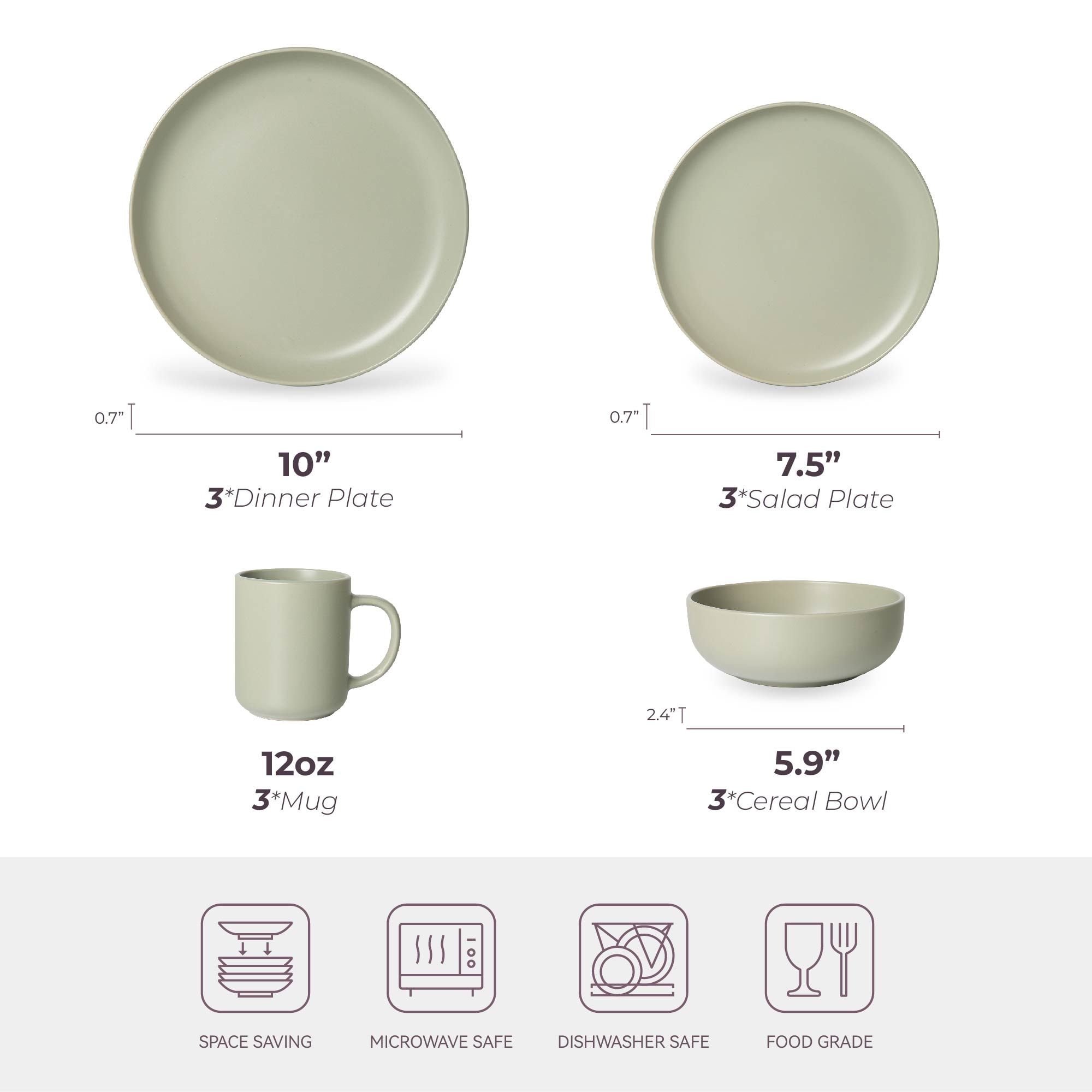 2. "[Complete 12pc Service for 3]": "Includes 3 dinner plates (10\"), 3 salad plates (7.5\"), 3 cereal bowls (5.9\"), and 3 mugs (12oz) - perfect for small families or couples."
