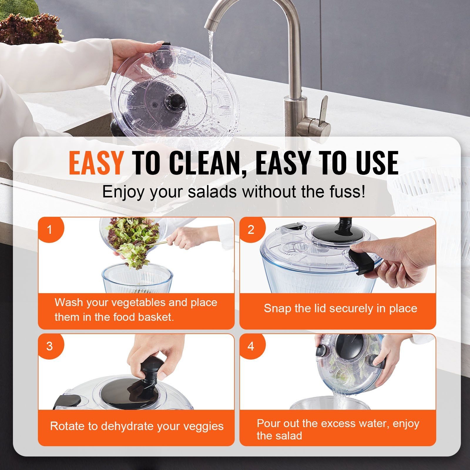 2.Effortless Cleaning Made Simple: Experience the ease of cleaning with our fruit spinner! Just wash your veggies, place them in the food basket, snap the lid shut, and give it a quick spin. For a thorough cleanup, you can easily detach the top and toss it in the dishwasher. No more scrubbing or soaking - it's a breeze to keep your vegetable spinner dryer sparkling clean.